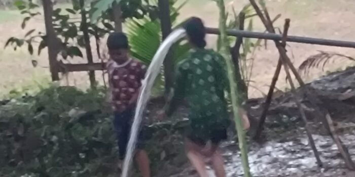 Keceriaan anak-anak yang mandi di bawah pancuran air dari sumur bor menjadi simbol kesederhanaan yang bermakna.