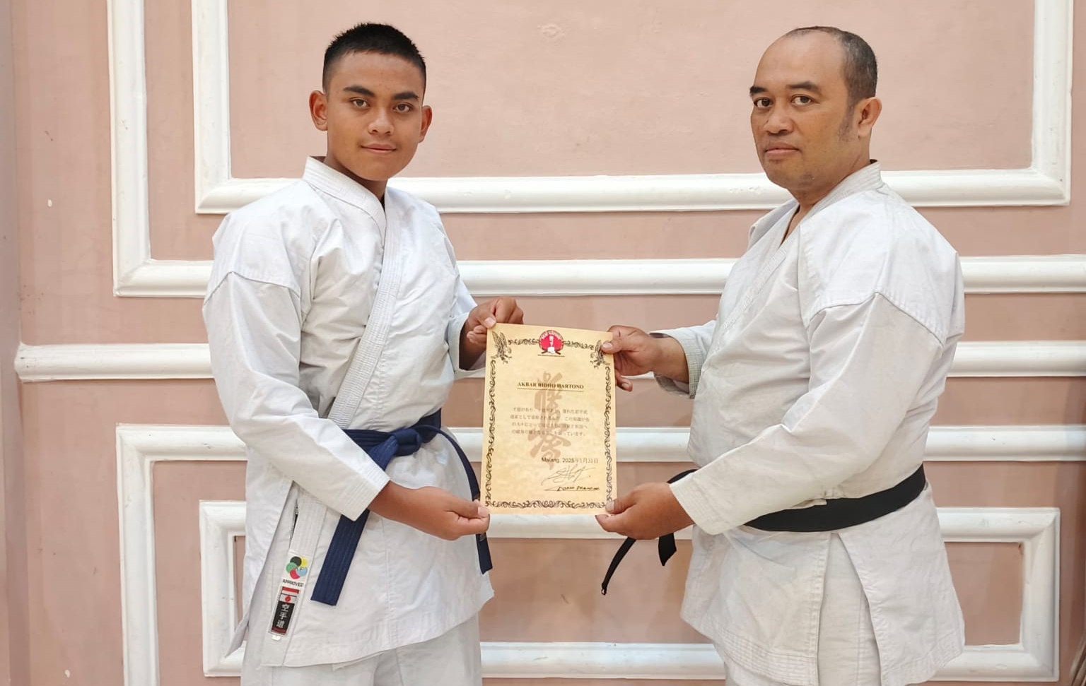 Atas dedikasi dan prestasi, Shihan Rudhi Pramono memberikan penghargaan kepada Akbar Ridho Hartono. Penyerahan Piagam Penghargaan berlangsung di Dojo Katsuge Jalan Sukun Gempol 21 8/9 Kota Malang, Jawa Timur, Kamis (30/01/2025).