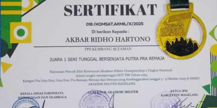 Kota Magelang,Kompas85id.com – Prestasi membanggakan kembali ditorehkan oleh atlet muda asal Magelang, Akbar Ridho Hartono, yang berhasil meraih Juara 1 Kelas Pra Remaja Seni Tunggal Baku Senjata pada Kejuaraan Pencak Silat Komisariat Akademi Militer Championship 2025, Sabtu (4/10/2025) di GOR Soeroto Akademi Militer Magelang.