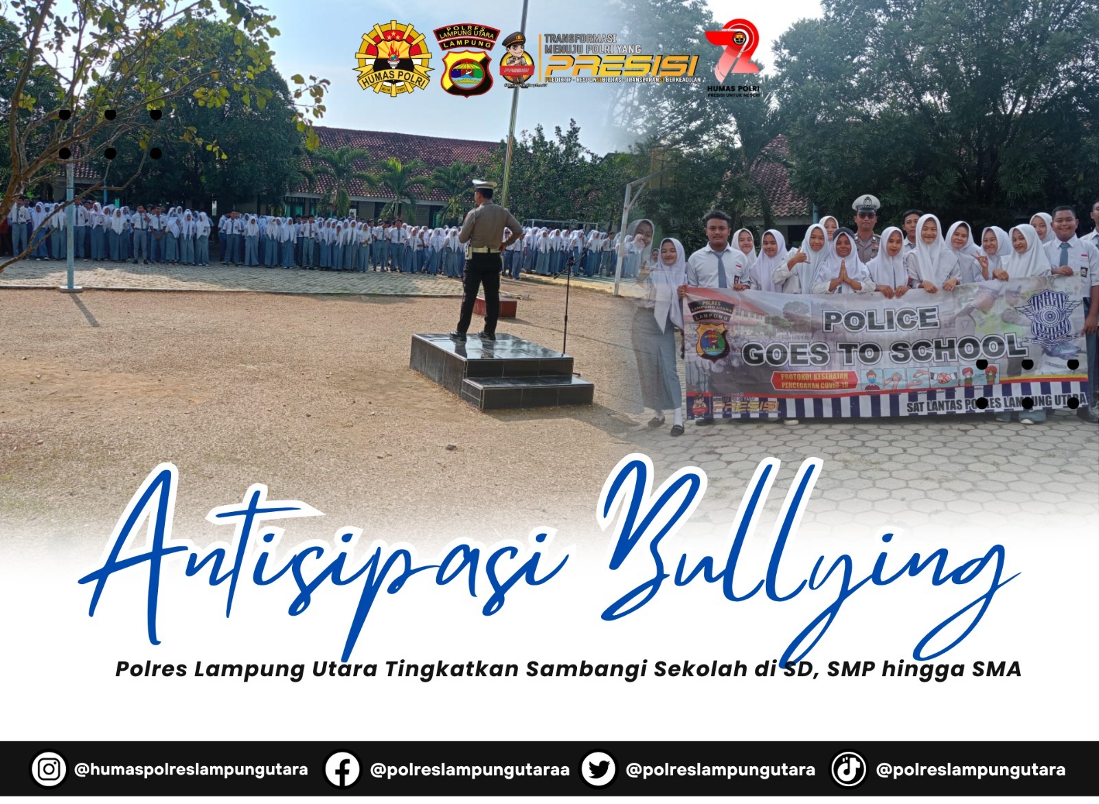 Lampung Utara,mediakompas86.com Police Goes To Shool program yang digalakkan Kapolres Lampung Utara guna menekan kriminalitas di kalanan pelajar termasuk aksi bullying di sekolah tingkat SD, SMP hingga SMA.