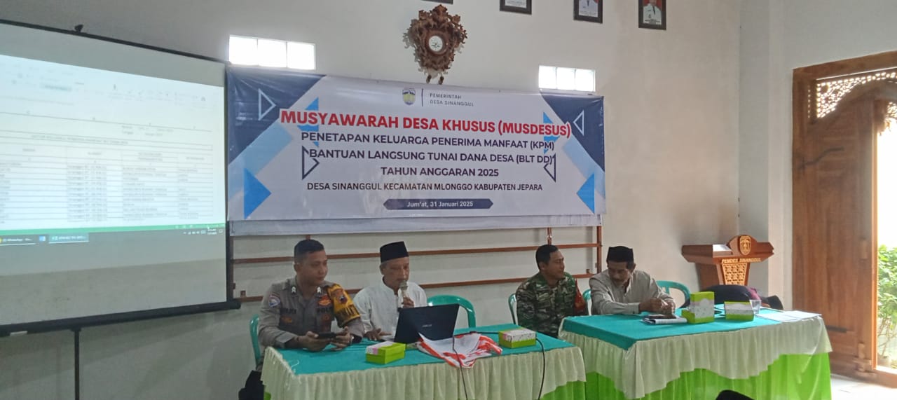 Mediakompas86.com-Jepara,31-1-2025 – Babinsa Kodim 0719/Jepara aktif mendukung kegiatan masyarakat di wilayah tugasnya. Pada Jumat (31/1/2025), Serda Juri hadir dalam Musyawarah Desa Khusus (Musdesus) di Desa Sinanggul, Kecamatan Mlonggo, Kabupaten Jepara. Agenda utama Musdesus tersebut adalah penetapan Keluarga Penerima Manfaat (KPM) untuk Bantuan Langsung Tunai Dana Desa (BLT-DD) Tahun Anggaran 2025.