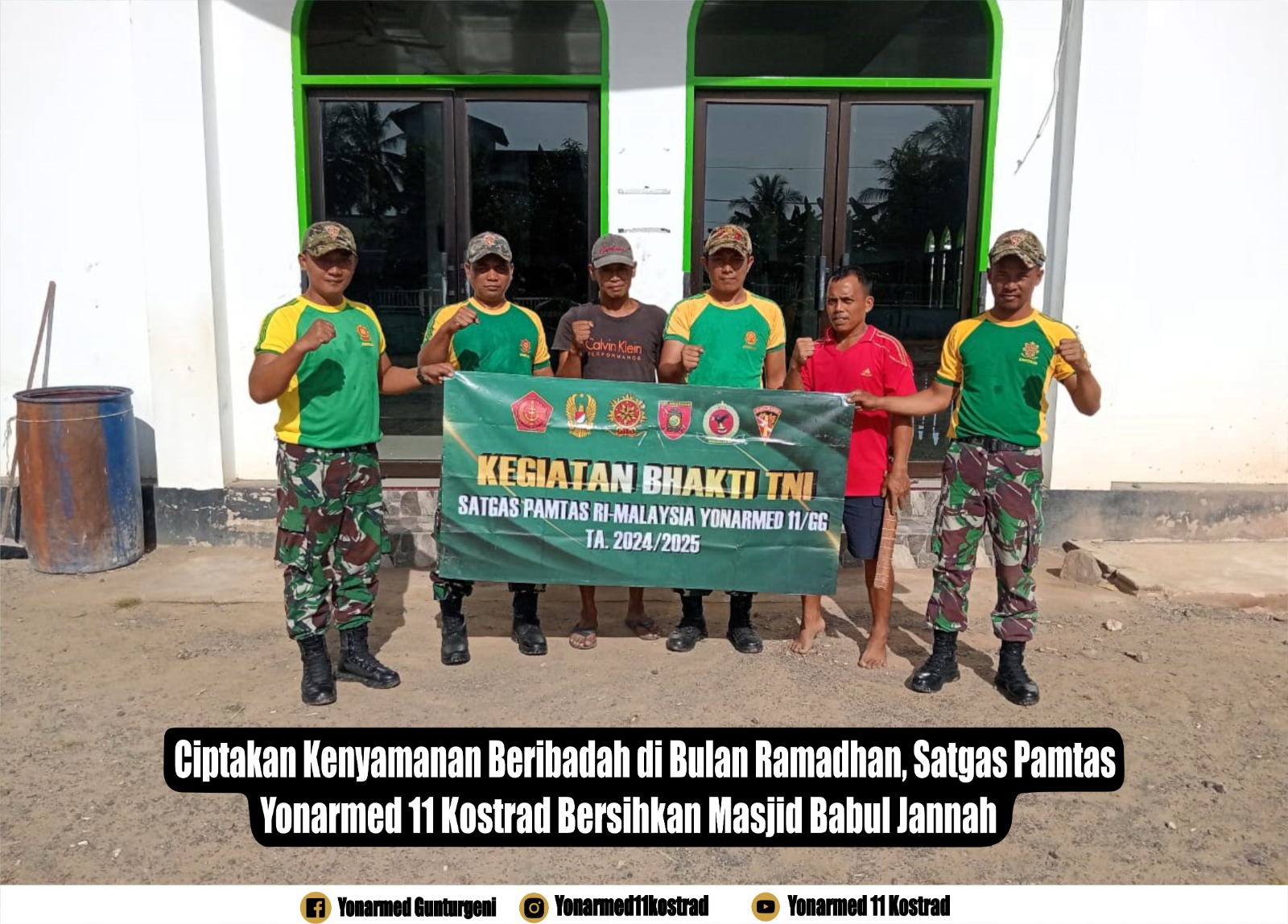 Nunukan, Mediakompas86.com – Dalam rangka menciptakan kenyamanan beribadah di bulan suci Ramadhan, Satgas Pamtas Yonarmed 11 Kostrad Pos Tanjung Aru bersama warga melaksanakan karya bakti pembersihan Masjid Babul Jannah di Desa Tanjung Aru, Kecamatan Sebatik Timur, Kabupaten Nunukan. Selasa, (4/3/2025).