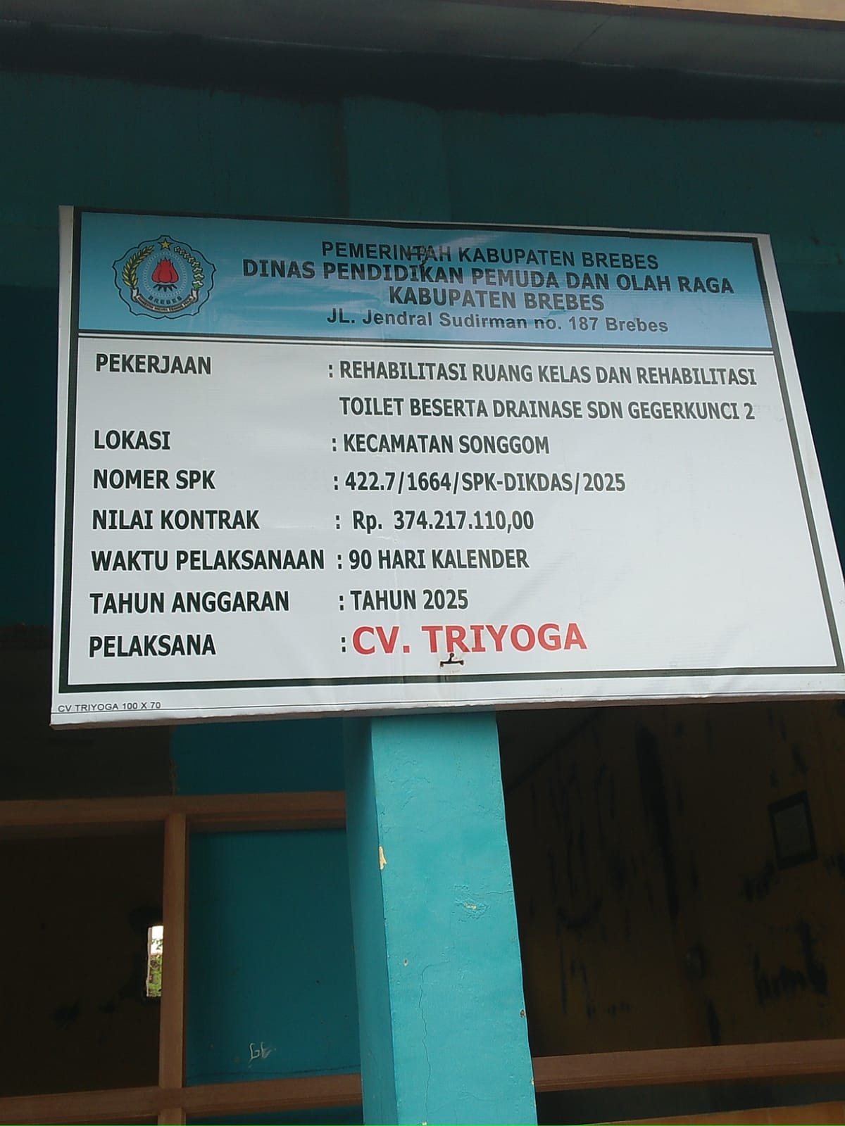 Proyek rehabilitasi gedung SD Negeri Geger Kunci 02 Songgom, Kabupaten Brebes, yang bersumber dari dana aspirasi dengan nilai anggaran sebesar Rp374.217.110,00, diduga mengalami sejumlah penyimpangan dalam pelaksanaannya. CV Triyoga selaku pelaksana proyek disorot karena penggunaan material yang dinilai tidak sesuai dengan spesifikasi teknis yang telah ditetapkan.