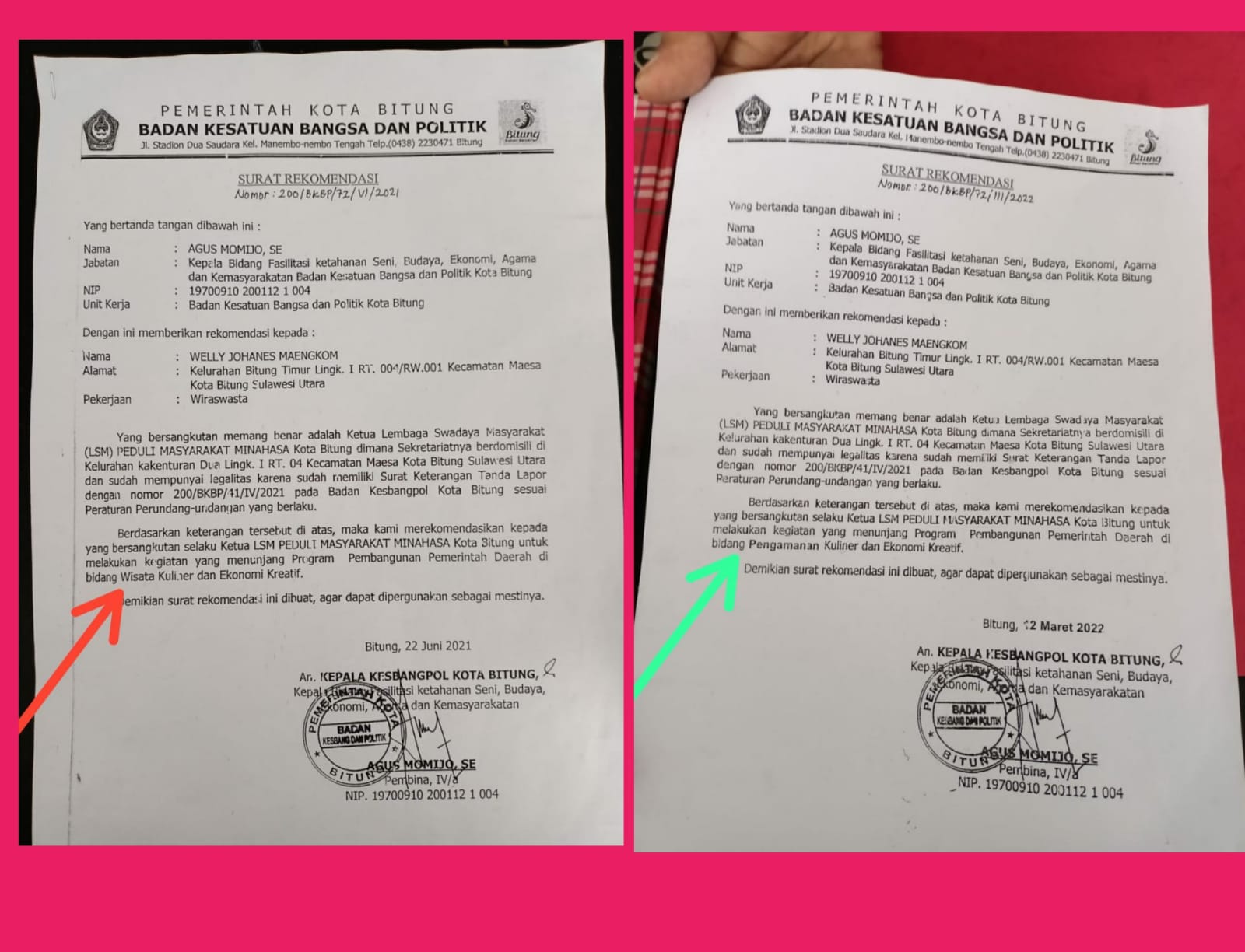 Badan Kesbangpol Kota Bitung secara kelembagaan akan segera melaporkan dugaan tindak pidana Pemalsuan yang dilakukan Ormas Peduli Masyarat Minahasa – PMM dan CV. Teguh Karya Sejahtera, terhadap dokumen Kesbangpol yang selama ini dijadikan alasan mereka untuk melakukan penagihan jasa keamanan, dikawasan Pusat Kota Bitung. Kepastian laporan ini dirumuskan dalam rekomendasi Pemerintah, menyikapi permasalahan dugaan praktek pungli pusat Kota Bitung, dalam rapat koordinasi yang dilaksanakan Badan kesbangpol, di riverside resto, 23 Jan 2023.