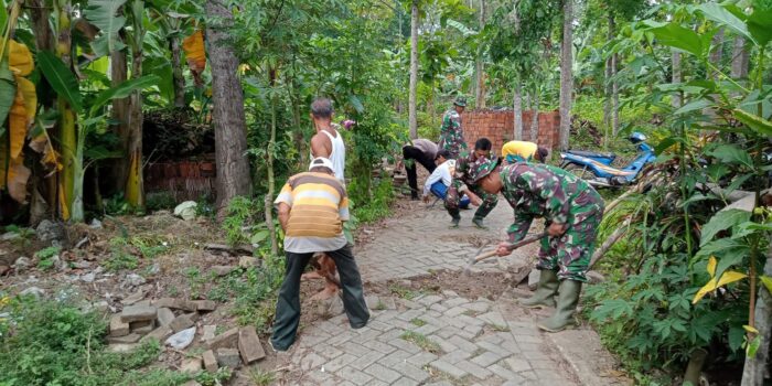 Suasana di lokasi kegiatan menggambarkan semangat kebersamaan. Tampak seragam loreng TNI, cokelat Polri, dan pakaian kerja warga berpadu di satu garis kegiatan. Mereka memanggul batako, menata paving, hingga membersihkan material dengan penuh kekompakan. Sinergi ini menjadi simbol kuatnya tiga pilar desa: TNI, Polri, dan masyarakat.