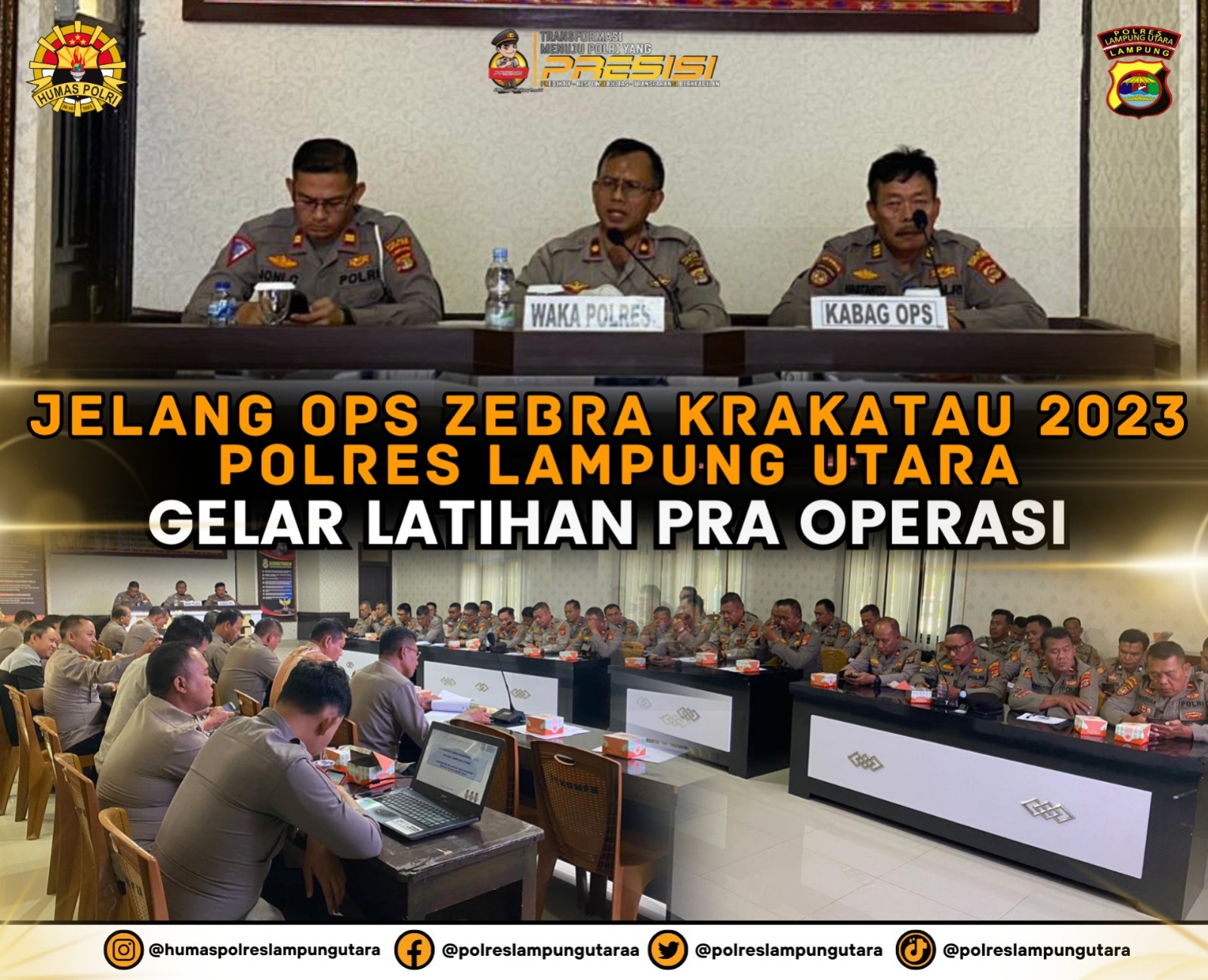 Kegiatan Lat Pra Ops tersebut dipimpin oleh Waka Polres Kompol Dwi Santosa, S.H. mewakili Kapolres Lampung Utara AKBP Teddy Rachesna, S.H., S.I.K., M.Si. dan di hadiri Perwira serta Brigadir yang terlibat dalam Sprin Ops Zebra Krakatau 2023.