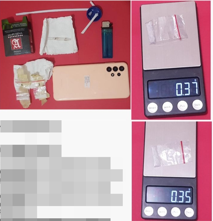 “Satu paket narkotika jenis sabu terbungkus plastik transparan dengan bruto ± 0,37 gram dan satu paket sabu dengan bruto ± 0,35 gram, kemudian 1 buah pipet kaca, 2 lembar potongan selotip warna kuning, 2 lembar potongan tisu warna putih, 1 buah tutup botol warna biru yang dimodifikasi dengan sedotan putih menjadi alat hisap sabu, 1 korek gas warna biru, 1 buah bekas bungkus rokok dan 1 unit Handphone berhasil diamankan petugas,” kata Ipda Warsito.