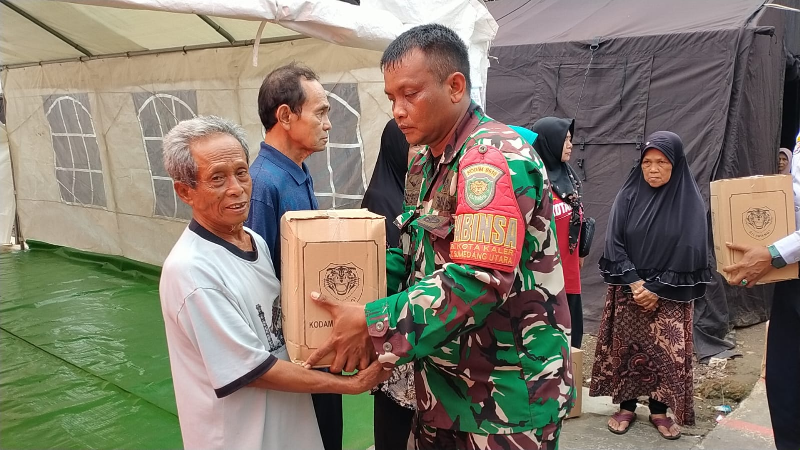 Bantuan Paket Sembako dari Pangdam III/Slw Mayjen TNI Erwin Djatniko disalurkan oleh Komandan Kodim 0610/Sumedang Letkol Kav Christian Gordon Rambu M.Si.(Han)., kepada warga yang terdampak bencana gempa bumi.