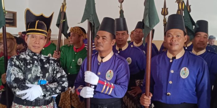 Sejumlah personel dari Kodim 0719/Jepara tampil mengenakan pakaian khas prajurit kerajaan lengkap dengan atribut tombak, yang menggambarkan keberanian dan keperkasaan dari tradisi militer Jepara pada masa lalu.