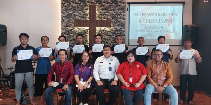Rangkaian acara diawali dengan sambutan Kepala Lapas Kelas IIA Sidoarjo yang diwakili oleh Kasubsi Bimkemaswat, dilanjutkan dengan sambutan dari Ibu Reggy selaku perwakilan Sekolah Tinggi Teologi Anugrah Indonesia, kemudian penyerahan sertifikat kelulusan D1 Teologi kepada tujuh warga binaan, dan ditutup dengan ibadah bersama yang dipimpin oleh Pendeta Himawan.