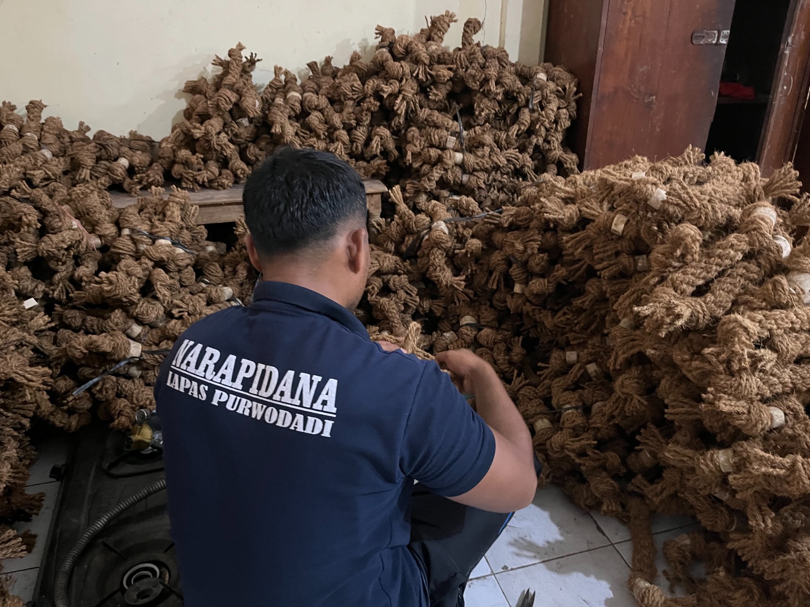 Hal tersebut diwujudkan dalam karya nyata melalui kerja sama dengan PT Chewy Louis, Lapas Purwodadi mengembangkan produksi kerajinan mainan hewan dari sabut kelapa (cocorope).