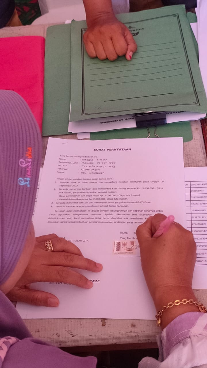 Syarat administrasi itu tertuang pada surat pernyataan yang harus ditanda-Tangani pedagang pasar, untuk mendapatkan Bantuan pemerintah. Pada point (3) disebutkan dengan jelas bersedia menerima bantuan dan dipindahkan ke lokasi yang disiapkan PD. Pasar. Lembar pernyataan itu harus ditanda-tangani pedagang, dan juga Kanit Pasar Cita serta diketahui Camat Maesa.