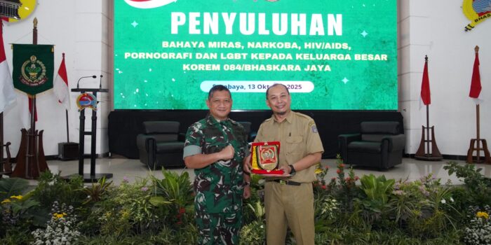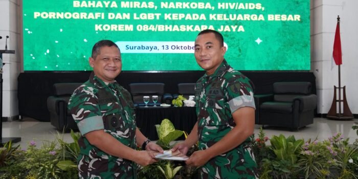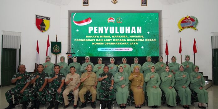 Surabaya, Kompas86id.com – Korem 084/Bhaskara Jaya menggelar penyuluhan tentang bahaya minuman keras (miras), narkoba, HIV/AIDS, dan perilaku menyimpang LGBT di Aula Makorem 084/BJ, Surabaya, Senin (13/10/2025). Kegiatan ini bertujuan meningkatkan kesadaran dan pemahaman anggota TNI, PNS, Persit, serta generasi muda tentang dampak negatif penyalahgunaan zat berbahaya dan perilaku menyimpang yang merusak moral bangsa.