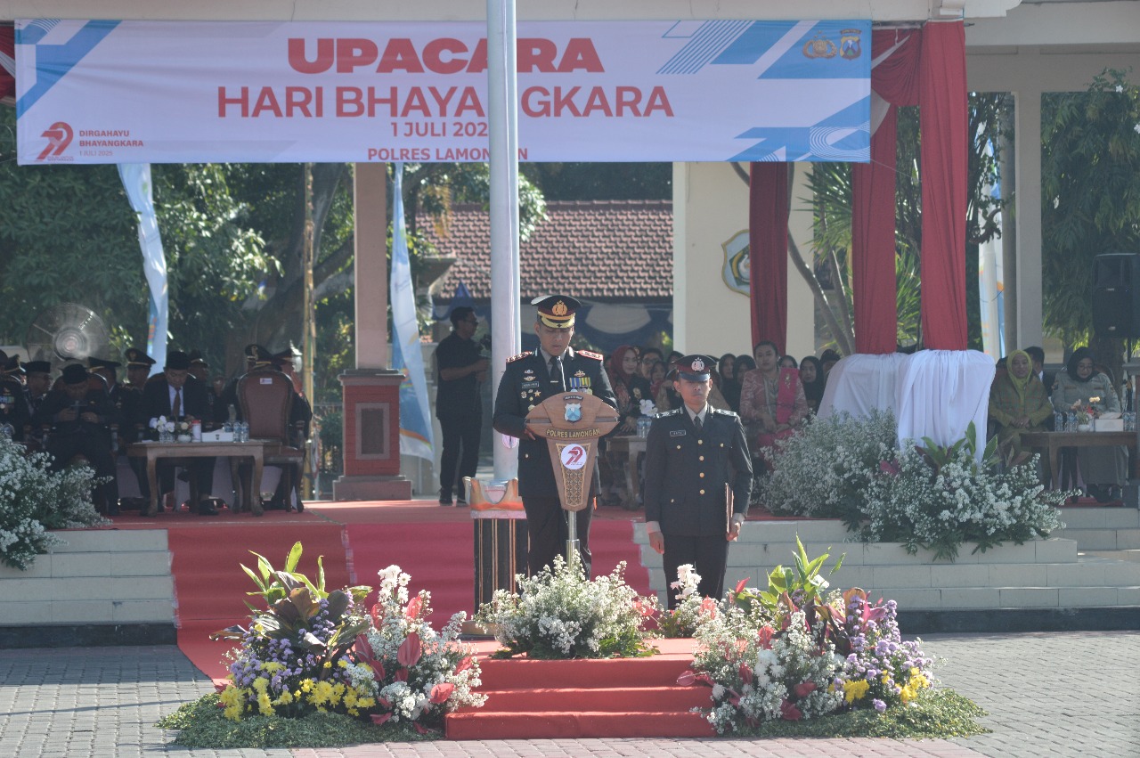 Dalam upacara tersebut, Kapolres Lamongan membacakan amanat Kapolda Jawa Timur yang berisi apresiasi dan refleksi atas kinerja Kepolisian sepanjang satu tahun terakhir, serta harapan besar ke depan dalam mewujudkan Polri yang semakin Presisi.