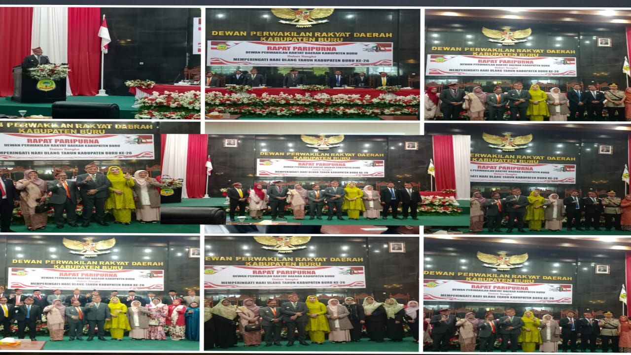 Rapat Paripurna DPRD Kabupaten Buru pada hari ini Sabtu 11 Oktober 2025 dengan Agenda Peringatan HUT Kab Buru ke – 26 yang dihadiri Bupati dan Wakil Bupati Kab Buru Ikram Umasugi S.E dan Sudarmo S.P.,M.Si , turut dihadiri oleh Anggota DPRRI Komisi V Saadia Ulluputy , Kepala Biro Pemprov Maluku , Wakil Bupati Bursel dan Sekda , unsur Forkopimda , KPU , BAWASLU , Sekda Kab Buru M . Ilias Hamid S.H.,M.H , dan jajaran OPD Pemda Kab Buru .