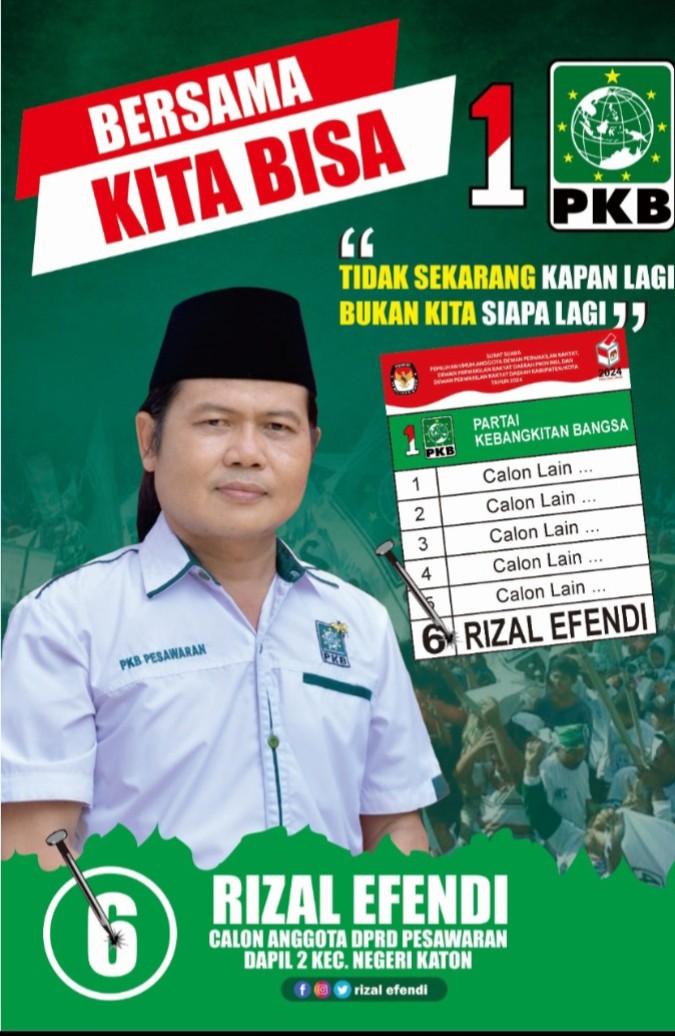Rizal Efendi Bacaleg No urut 06 Dari Partai kebangkitan Bangsa (PKB) Maju mencalonkan diri menjadi anggota DPRD Kabupaten pesawaran di dapil 2 kecamatan negri Katon kabupaten pesawaran, pada tahun 2024 mendatang.Rabo (11/10/2023)