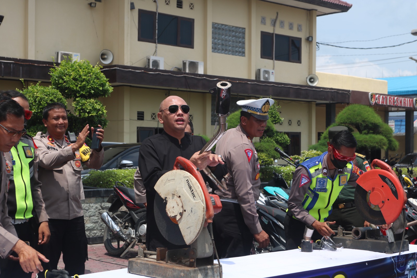 Wali Kota, Kapolresta Tegal dan Forkopimda Kota Tegal berkesempatan melaksanakan pemusnahan knalpot brong dengan cara menggergaji knalpot brong dengan gergaji listrik.