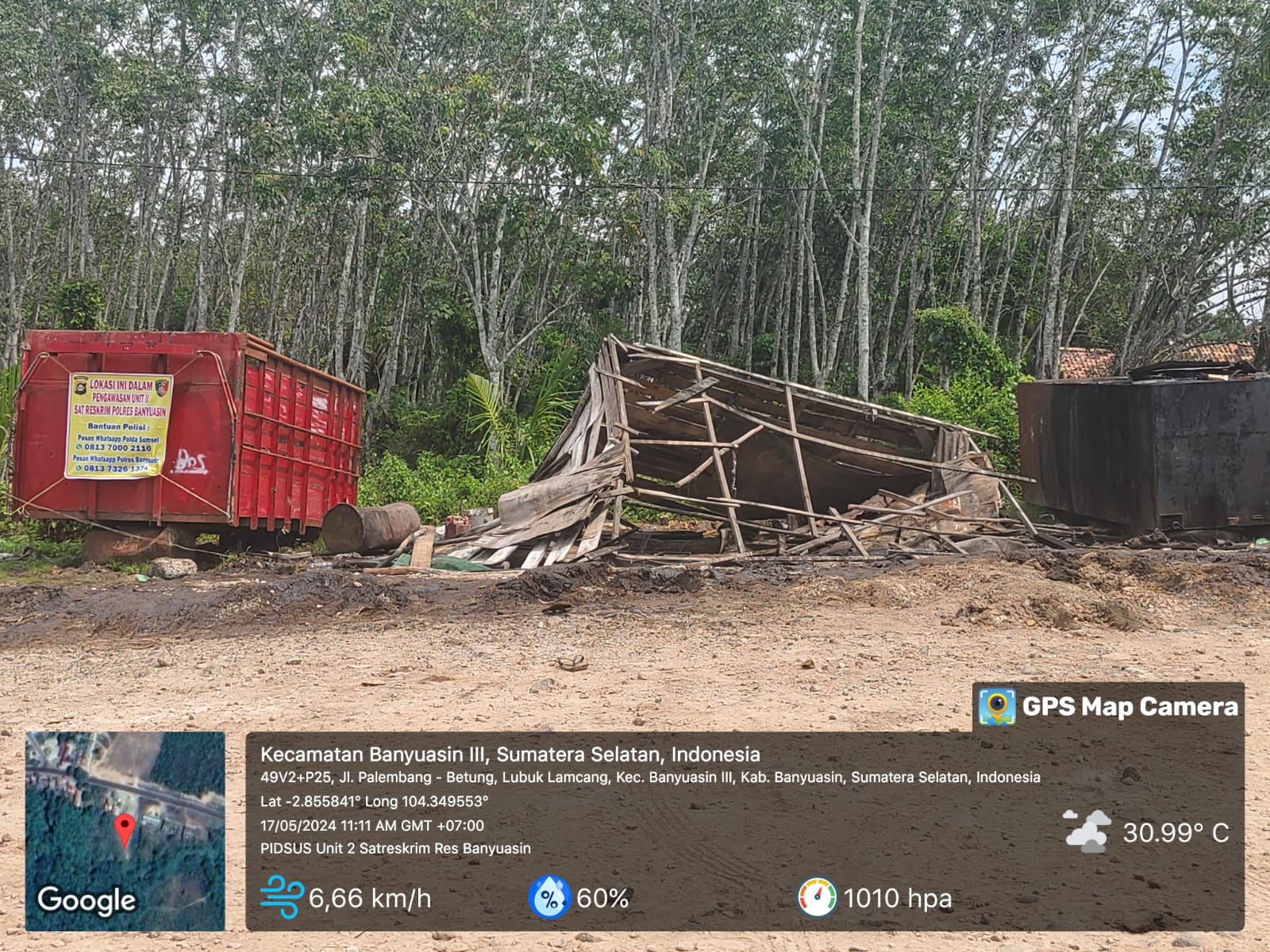 Team gabungan dari Polres Banyuasin dan Sat Pol PP Banyuasin telah melakukan penertiban tempat tertutup/ gudang yang diduga sebagai tempat penimbunan CPO yang tidak dilengkapi izin di Jalan Palembang-Betung RT 002 RW 001 Desa Lubuk Lancang Kecamatan Suak Tapeh Kabupaten Banyuasin. Dengan titik koordinat : (-2°51’21” S 104°20’58” E)