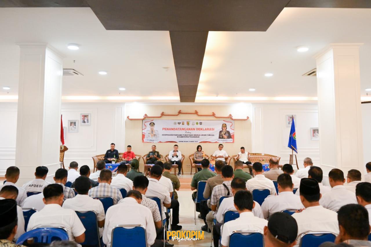 Forum Komunikasi Pimpinan Daerah (Forkopimda) Kabupaten Pesawaran menandatangani deklarasi penertiban kegiatan hiburan organ tunggal di Kabupaten Pesawaran di Aula Pemkab Pesawaran, Rabu (27/03/24).