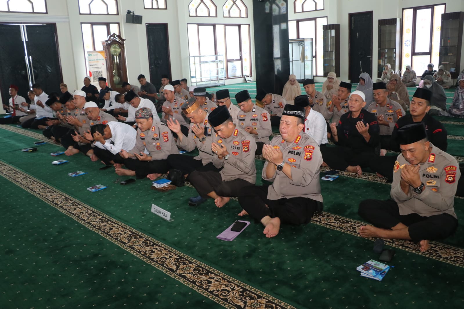Wakapolda Sumsel Brigjen Pol, M.Zulkarnain SIK MSi diwakili Karo SDM Polda Sumsel Kombes Pol Sudrajad Hariwibowo SIK MSI melepas 40 jamaah haji Polda Sumsel, di Masjid Assaadah Mapolda Sumsel Jalan Jenderal Sudirman Palembang, Rabu (17/05/2023).
